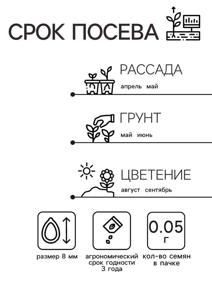 Семена высевают в марте-апреле, пикируют с развитием первой пары настоящих листочков по схеме 5х5 см, в открытый грунт рассаду высаживают с середины мая до начала июня.
