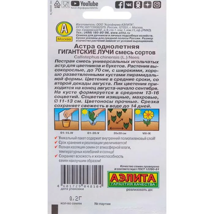 «Гигантские лучи» — смесь универсальных сортов однолетних астр для цветников и букетов. Срезанные соцветия сохраняют свежесть в воде до 14 дней. Растения холодостойкие, светолюбивые, не выносят застоя воды в почве.