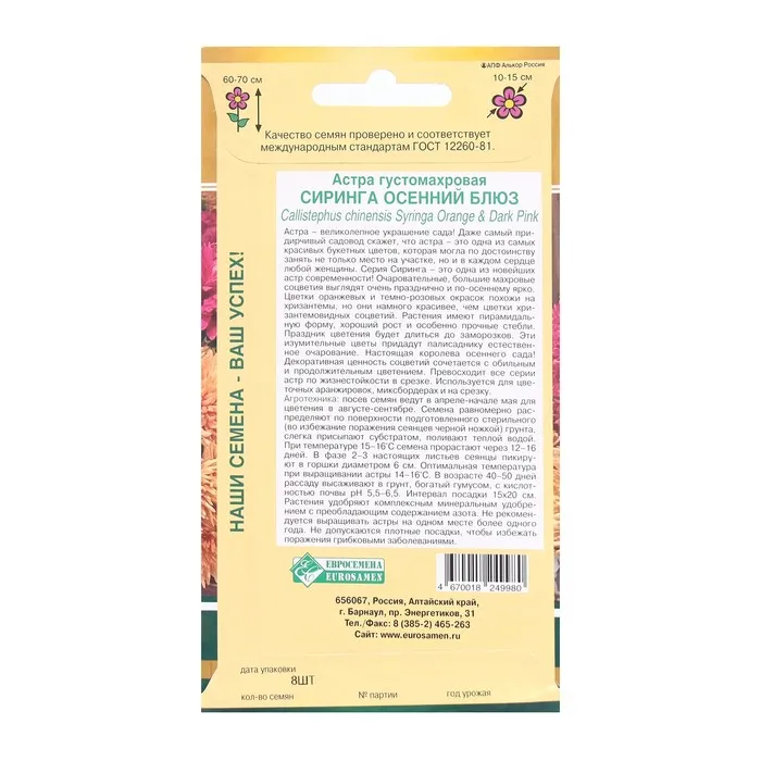 Астра Гала - однолетник с очень плотными игольчатыми соцветиями и крепкими цветоносами для профессионального выращивания на срезку. Характеризуется ранним и длительным цветением, высокой устойчивостью к болезням и разнообразием окрасок. Растение пирамидальной букетной формы с широким спектром применения: посадка в сборные цветники группами, групповые посадки на газоне, на рабатки – рядами и озеленение бордюров. Астры Gala в букетах просто неотразимы, долго не теряют своих декоративных качеств. Высокие показатели всхожести и сортовой чистоты.