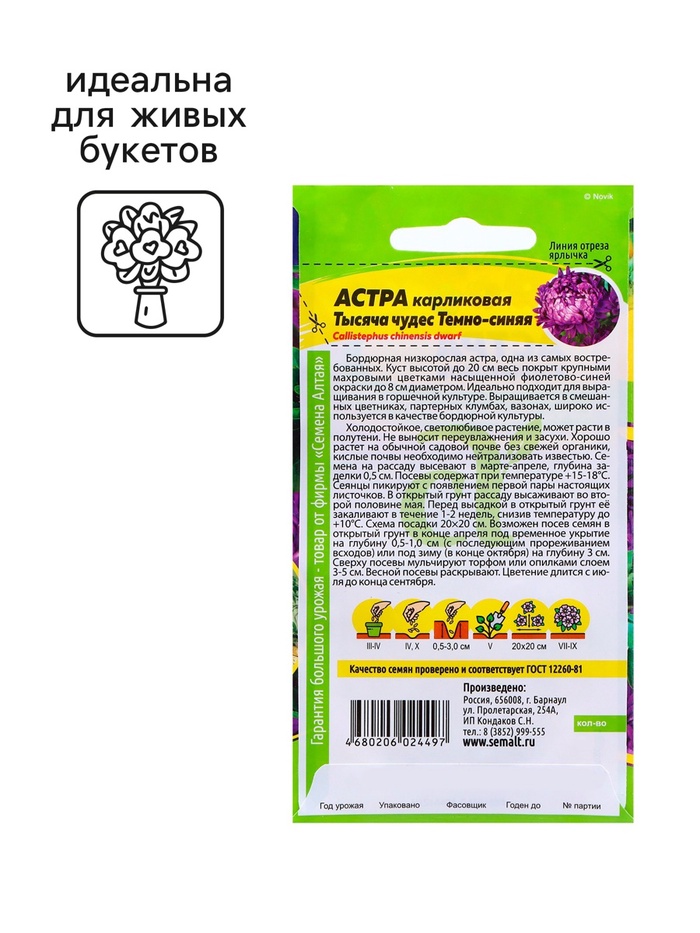 Бордюрная низкорослая астра, одна из самых востребованных. Куст высотой до 20 см весь покрыт крупными махровыми цветками насыщенной фиолетово-синей окраски до 8 см диаметром. Идеально подходит для выращивания в горшечной культуре. Выращивается в смешанных цветниках, партерных клумбах, вазонах, широко используется в качестве бордюрной культуры. Холодостойкое, светолюбивое растение, может расти в полутени. Не выносит переувлажнения и засухи. Хорошо растет на обычной садовой почве без свежей органики, кислые почвы необходимо нейтрализовать известью. Семена на рассаду высевают в марте-апреле, глубина заделки 0,5 см. Посевы содержат при температуре +15-18°С. Сеянцы пикируют с появлением первой пары настоящих листочков. В открытый грунт рассаду высаживают во второй половине мая. Перед высадкой в открытый грунт её закаливают в течение 1-2 недель, снизив температуру до +10°С. Схема посадки 20×20 см. Возможен посев семян в открытый грунт в конце апреля под временное укрытие на глубину 0,5-1,0 см (с последующим прореживанием всходов), или под зиму (в конце октября) на глубину 3 см. Сверху посевы мульчируют торфом или опилками слоем 3-5 см. Весной посевы раскрывают. Цветение длится с июля до конца сентября.