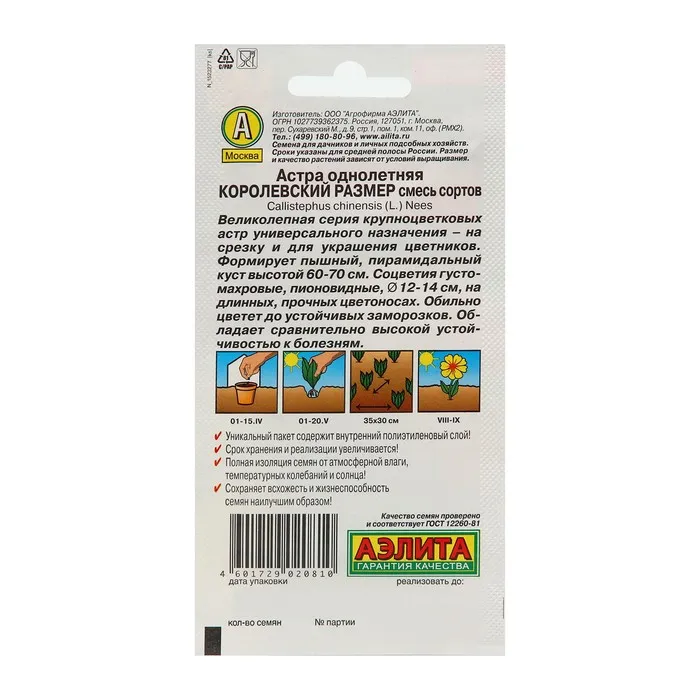 «Королевский размер» представляет собой смесь однолетних сортов крупноцветковых астр универсального назначения — для срезки и украшения цветников. Растение формирует пышный пирамидальный куст и густомахровые соцветия полусферической формы на длинных прочных цветоносах. Обладает сравнительно высокой устойчивостью к болезням.