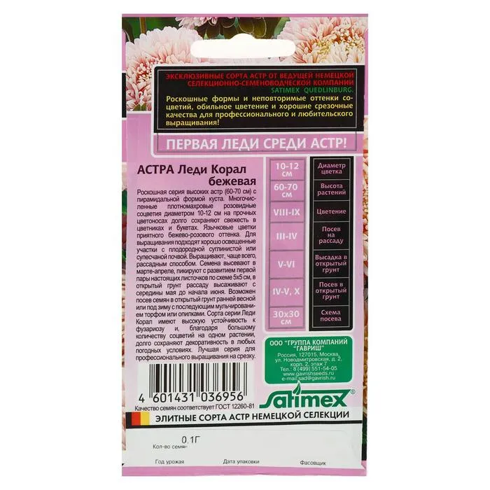 Семена цветов Астра "Леди Корал бежевая", ц/п, однолетняя, серия Эксклюзив, 0,05 г — Характеристики