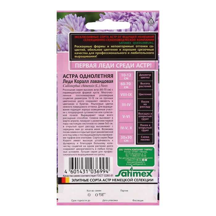 Семена цветов Астра "Леди Корал лавандовая", однолетняя, серия Эксклюзив, набор 5 шт — Характеристики