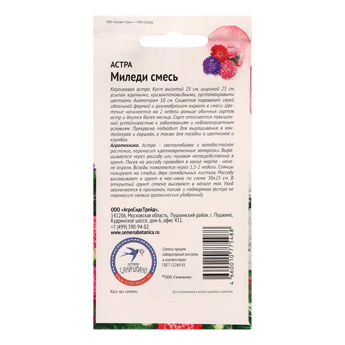 Карликовая астра. Куст высотой 25 см, шириной 25 см, усыпан крупными, хризантемовидными, густомахровыми цветками диаметром 10 см. Соцветия поражают своей идеальной формой и разнообразием окрасок в смеси. Цветение начинается на 2 недели раньше обычных сортов астр и длится более месяца. Сорт отличается повышенной устойчивостью к заболеваниям и неблагоприятным условиям. Прекрасно подходит для выращивания в контейнерах и горшках, а также для посадки в цветниках и клумбах. Агротехника: Астра - светолюбивое и холодостойкое растение, переносит кратковременные заморозки. Выращивается через рассаду или посевом непосредственно в грунт. Посев на рассаду проводят в конце марта - начале апреля. Всходы появляются через 1,5-2 недели. Сеянцы пикируют на стадии двух семядольных листьев. Рассаду высаживают в грунт в мае-июне по схеме 30х25 см. В открытый грунт семена высевают в начале мая. Уход заключается в прополках, поливе и подкормках (астра не переносит свежих органических удобрений). Штрих-код - 4660010777642