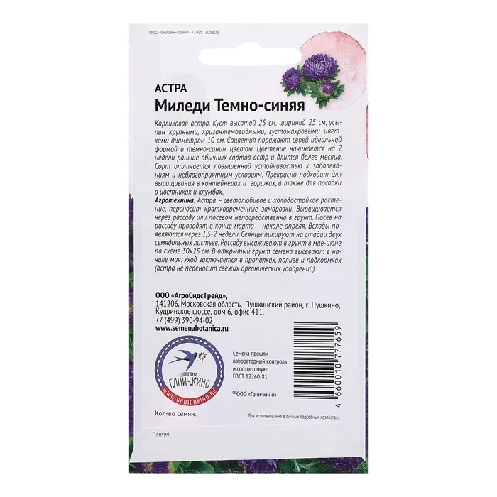 Карликовая астра. Куст высотой 25 см, шириной 25 см, усыпан крупными, хризантемовидными, густомахровыми цветками диаметром 10 см. Соцветия поражают своей идеальной формой и темно-синим цветом. Цветение начинается на 2 недели раньше обычных сортов астр и длится более месяца. Сорт отличается повышенной устойчивостью к заболеваниям и неблагоприятным условиям. Прекрасно подходит для выращивания в контейнерах и горшках, а также для посадки в цветниках и клумбах. Агротехника: Астра - светолюбивое и холодостойкое растение, переносит кратковременные заморозки. Выращивается через рассаду или посевом непосредственно в грунт. Посев на рассаду проводят в конце марта - начале апреля. Всходы появляются через 1,5-2 недели. Сеянцы пикируют на стадии двух семядольных листьев. Рассаду высаживают в грунт в мае-июне по схеме 30х25 см. В открытый грунт семена высевают в начале мая. Уход заключается в прополках, поливе и подкормках (астра не переносит свежих органических удобрений). Штрих-код - 4660010777659