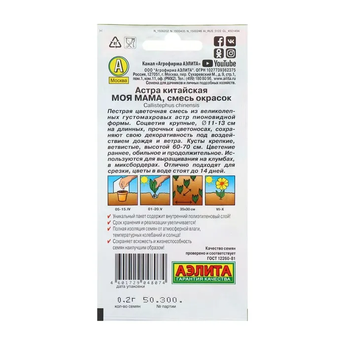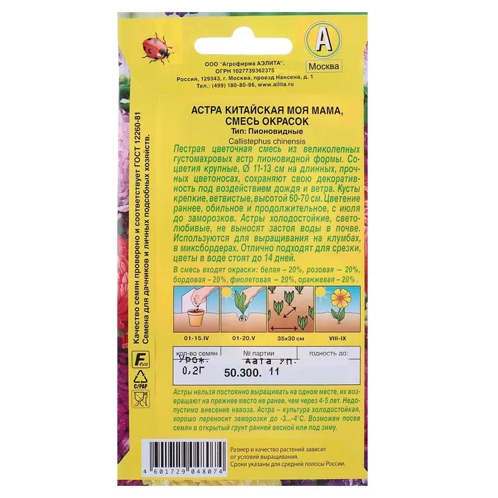Пестрая цветочная смесь высокорослых (70 см) астр придаст очарование любому уголку вашего сада. Густо-махровые соцветия Ø12 см восхищают насыщенными расцветками и эталонной пионовидной формой. Цветение обильное и длительное, вплоть до заморозков. Цветы на длинных, очень прочных стеблях идеальны для срезки и долго стоят в букете.
