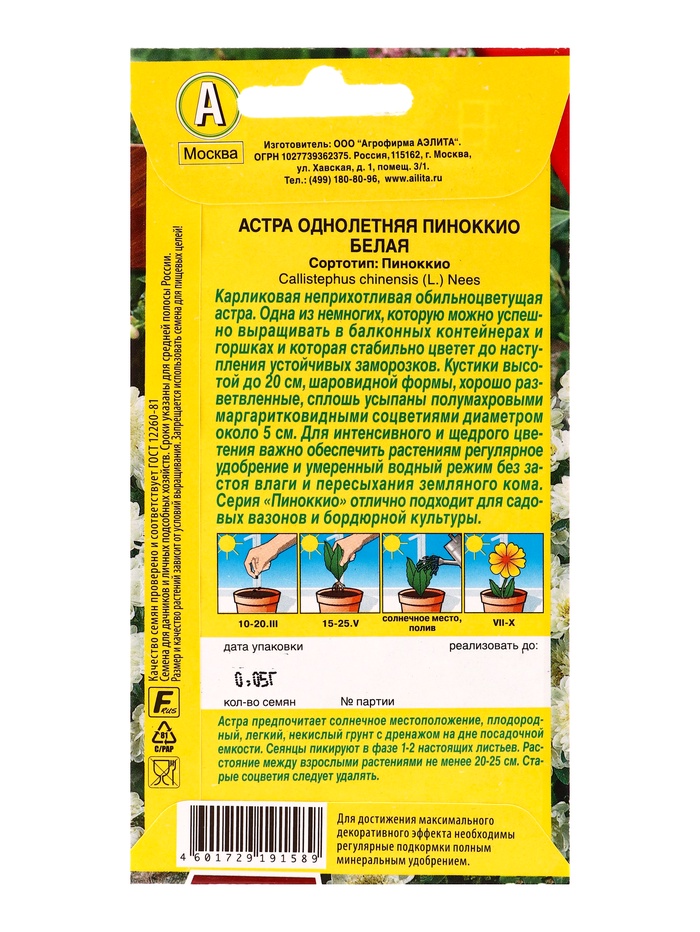 Семена цветов Астра Пиноккио белая Цветущий балкон, Ц/П,0,05 г — Характеристики