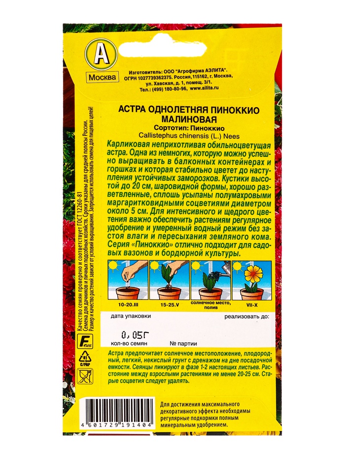 Семена цветов Астра Пиноккио малиновая Цветущий балкон, Ц/П,0,05 г — Характеристики