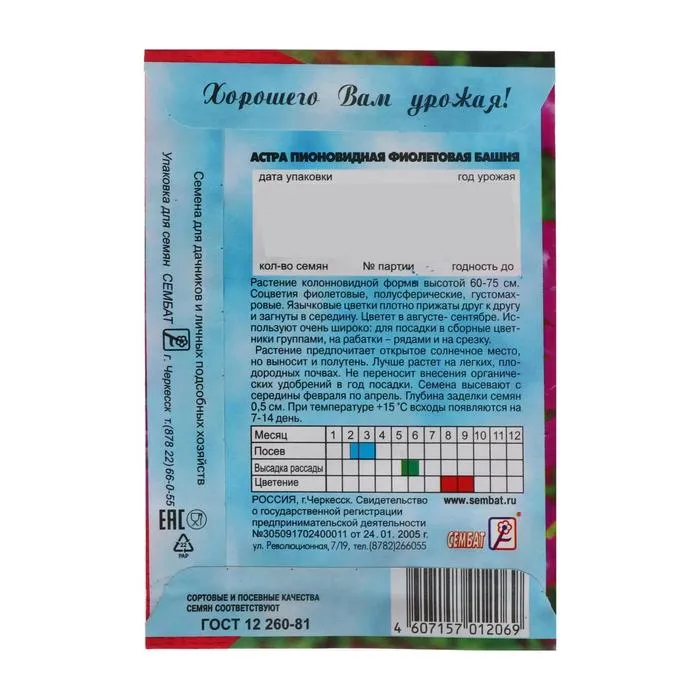 Однолетнее растение. Классическая пионовидная срезочная астра. Привлекательный обильно цветущий куст обратно пирамидальной формы с многочисленными соцветиями, высотой до 65 см. Цветоносы прочные, длиной 40-45 см. Соцветия махровые, полусферические или шаровидные, диаметром 8-10см. ярко-фиолетового цвета, до 10 штук на растении. Язычковые цветки прижаты друг к другу и загнуты в середину. Цветёт август-октябрь. Отличаются великолепными срезочными свойствами, до двух недель стоят в воде, сохраняя декоративность. Прекрасно подойдут для оформления цветников и рабаток.