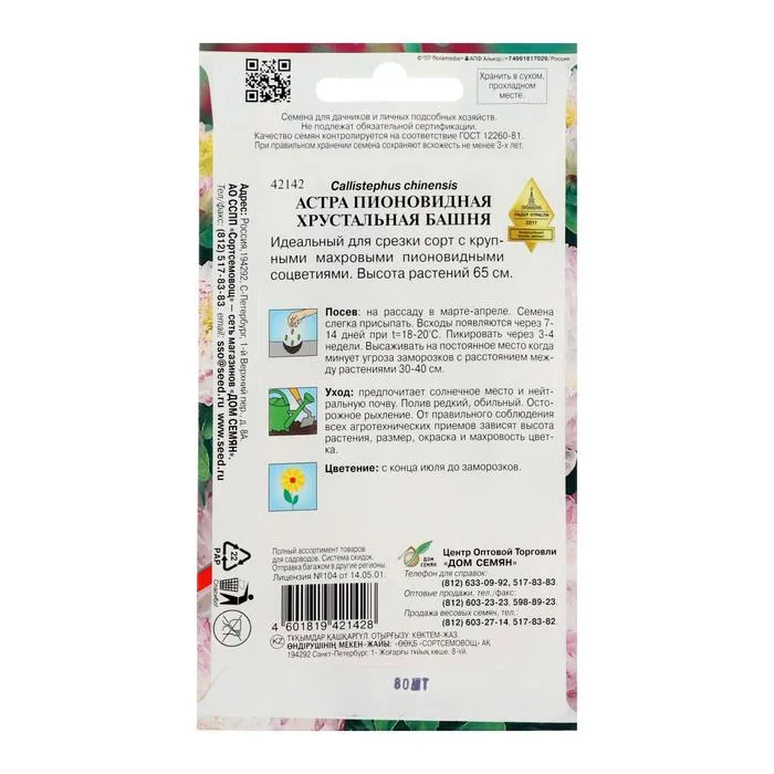Семена цветов Астра пионовидная "Хрустальная Башня" Дом семян, О, 80 шт — Характеристики