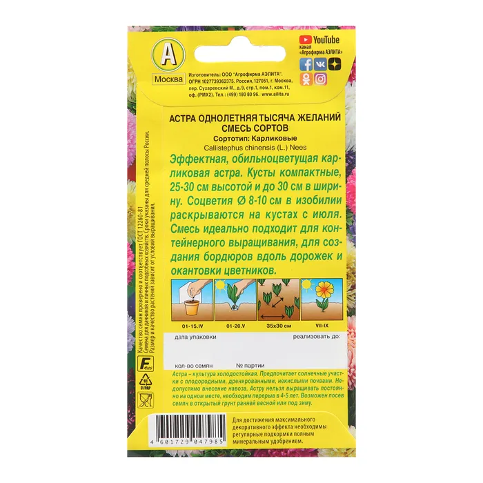 Семена цветов Астра "Тысяча желаний", смесь окрасок, О, 0,2 г — Характеристики