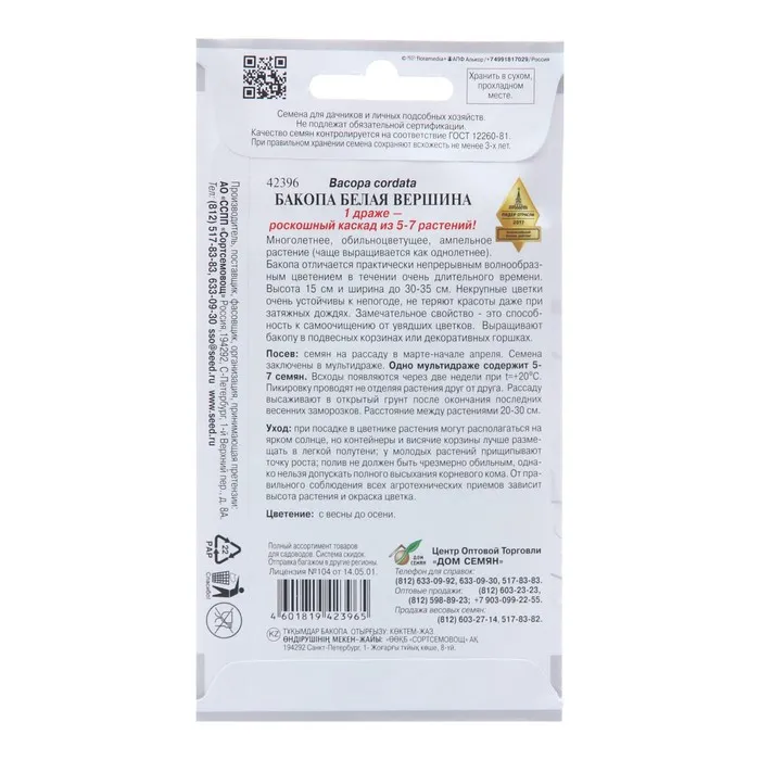 1 драже — роскошный каскад из 5-7 растений.Многолетнее, обильноцветущее, ампельное растение (чаще выращивается как однолетнее). Бакопа отличается практически непрерывным волнообразным цветением в течении очень длительного времени. Высота 15 см и ширина до 30-35 см. Некрупные цветки очень устойчивы к непогоде, не теряют красоты даже при затяжных дождях. Замечательное свойство - это способность к самоочищению от увядших цветков. Выращивают бакопу в подвесных корзинах или декоративных горшках. Посев: семян на рассаду в марте - начале апреля. Семена заключены в мультидраже. Одно мультидраже содержит 5-7 семян. Пикировку проводят в подвесные кашпо, не отделяя растения друг от друга. Всходы появляются через две недели при t=+20ºС. Рассаду высаживают в открытый грунт после окончания последних весенних заморозков. Расстояние между растениями 20-30 см.