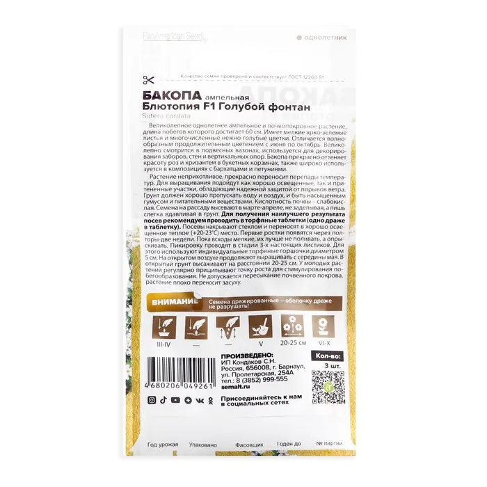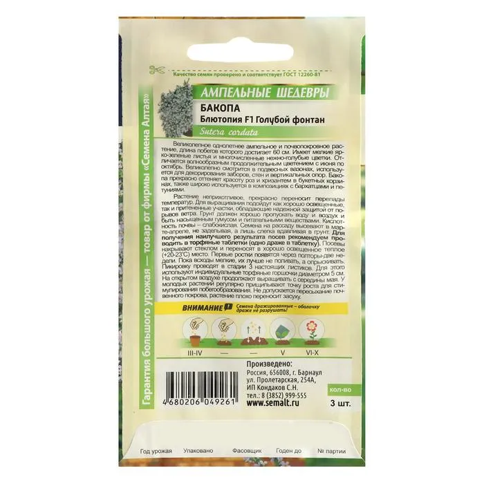 Великолепное однолетнее ампельное и почвопокровное растение, длина побегов которого достигает 60 см. Имеет мелкие ярко-зеленые листья и многочисленные нежно-голубые цветки. Отличается волнообразным продолжительным цветением с июня по октябрь. Великолепно смотрится в подвесных вазонах, используется для декорирования заборов, стен и вертикальных опор. Бакопа прекрасно оттеняет красоту роз и хризантем в букетных корзинах, также широко используется в композициях с бархатцами и петуниями.Растение неприхотливое, прекрасно переносит перепады температур. Для выращивания подойдут как хорошо освещенные, так и притененные участки, обладающие надежной защитой от порывов ветра. Грунт должен хорошо пропускать воду и воздух, и быть насыщенным гумусом и питательными веществами. Кислотность почвы – слабокислая. Семена на рассаду высевают в марте-апреле, не заделывая, а лишь слегка вдавливая в грунт. Для получения наилучшего результата посев рекомендуем проводить в торфяные таблетки (одно драже в таблетку). Посевы накрывают стеклом и переносят в хорошо освещенное теплое (+20-23оС) место. Первые ростки появятся через полторы-две недели. Пока всходы мелкие, их лучше не поливать, а опрыскивать. Пикировку проводят в стадии 3-х настоящих листиков. Для этого используют индивидуальные торфяные горшочки диаметром 5 см. На открытом воздухе продолжают выращивать с середины мая. В открытый грунт высаживают на расстоянии 20-25 см. У молодых растений регулярно прищипывают точку роста для стимулирования побегообразования. Не допускается пересыхание почвенного покрова, растение плохо переносит засуху.Внимание! Семена дражированные - оболочку драже не разрушать!