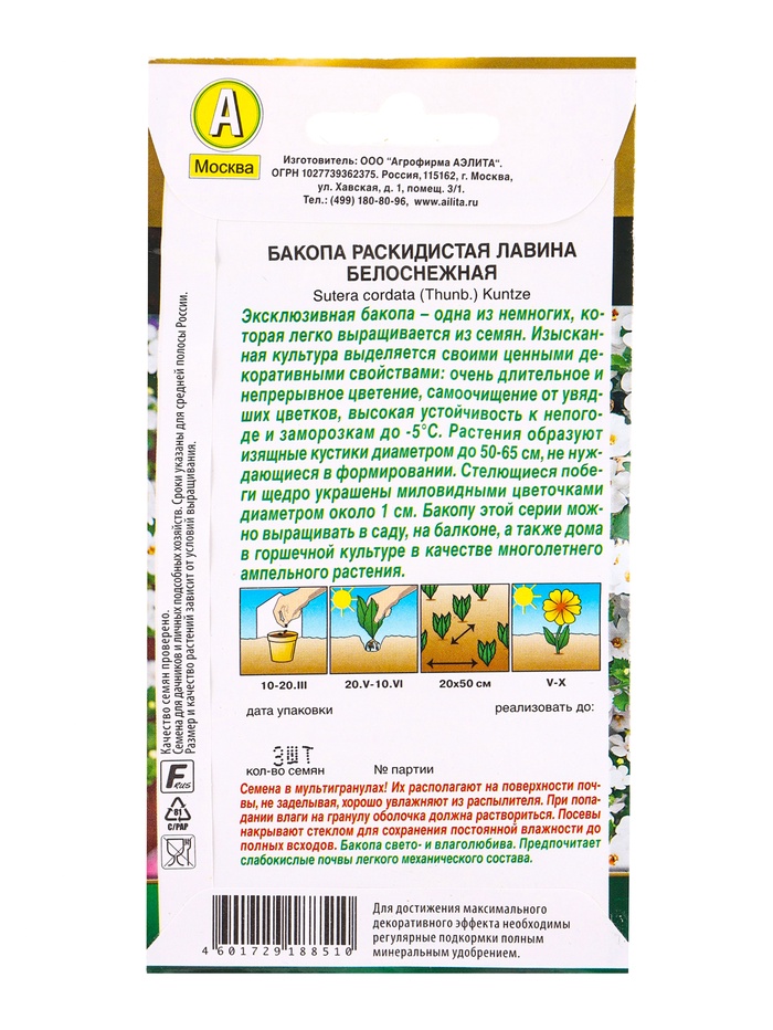 Семена цветов Бакопа раскидистая Лавина белоснежная (драже в пробирке) Золотая серия, Ц/П,3 шт. 109 — Характеристики