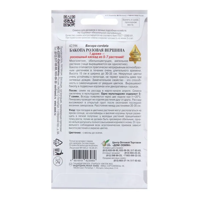 1 драже — роскошный каскад из 5-7 растений.Многолетнее, обильноцветущее, ампельное растение (чаще выращивается как однолетнее). Бакопа отличается практически непрерывным волнообразным цветением в течении очень длительного времени. Высота 15 см и ширина до 30-35 см. Некрупные цветки очень устойчивы к непогоде, не теряют красоты даже при затяжных дождях. Замечательное свойство - это способность к самоочищению от увядших цветков. Выращивают бакопу в подвесных корзинах или декоративных горшках. Посев: семян на рассаду в марте - начале апреля. Семена заключены в мультидраже. Одно мультидраже содержит 5-7 семян. Пикировку проводят в подвесные кашпо, не отделяя растения друг от друга. Всходы появляются через две недели при t=+20ºС. Рассаду высаживают в открытый грунт после окончания последних весенних заморозков. Расстояние между растениями 20-30 см.