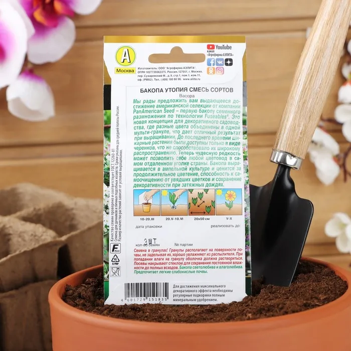 Семена в гранулах! Гранулы располагают на поверхности почвы, не заделывая их, хорошо увлажняют из распылителя. При попадании влаги на гранулу оболочка должна раствориться. Посевы накрывают стеклом для сохранения постоянной влажности до полных всходов. Бакопа светолюбива и влаголюбива. Предпочитает легкие слабокислые почвы.