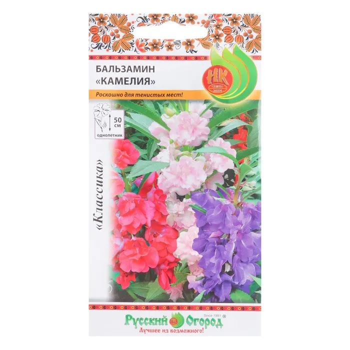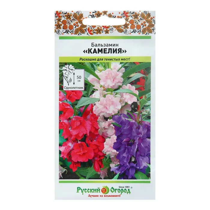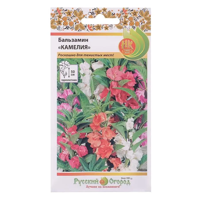 Бальзамин «Камелия» отличается крупными цветами и лёгкой волнистой обводкой лепестков. Цветовая гамма построена на розовом оттенке: белый, нежно-розовый, фуксия и фиолетовый. Поэтому вы можете вписать смесь либо в более крупный цветник похожих тонов, либо же посадить его отдельным ландшафтным элементом в саду.