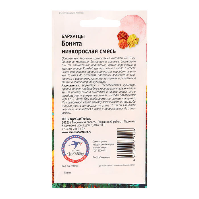 Семена цветов Бархатцы "Бонита смесь", 0,2 г — Характеристики