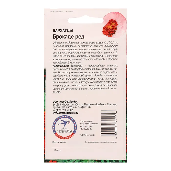Однолетник. Растения компактные, высотой 20-25 см. Соцветия махровые, достаточно крупные, диаметром 3-4 см, насыщенного красно-коричневого цвета. Сорт отличается продолжительным периодом цветения (с июня до сентября). Бархатцы великолепно смотрятся в цветниках, группами на газонах и рабатках, а также в контейнерной культуре. Агротехника: Бархатцы – теплолюбивая культура, предпочитает плодородные хорошо окультуренные почвы. На рассаду семена высевают в начале апреля или в середине мая в открытый грунт. Всходы появляются через 5-8 дней. При необходимости сеянцы пикируют. На постоянное место рассаду высаживают в мае, когда минует угроза заморозков, по схеме 15х30 см. Обильное цветение начинается в июне и продолжается до заморозков. Штрих-код - 4660010777376