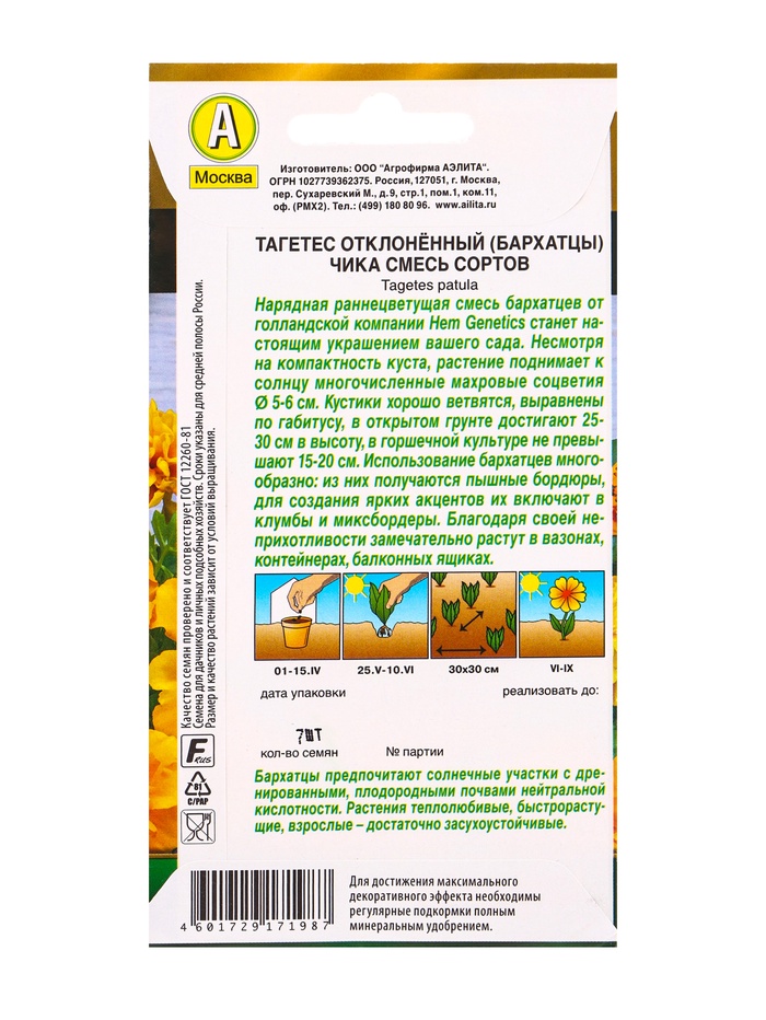 Семена цветов Бархатцы Чика отклоненные, смесь сортов С. Hem Genetics Золотая серия, Ц/П,7 шт. 1094 — Характеристики