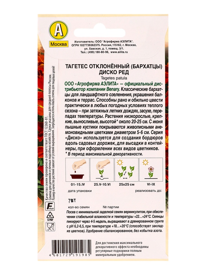 Семена цветов Бархатцы Диско ред отклоненные Спецсерия Benary, Ц/П,7 шт. — Характеристики