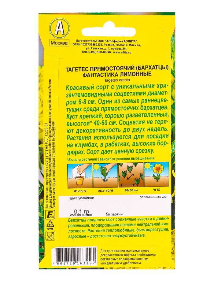 Семена цветов Бархатцы Фантастика лимонные , Ц/П,0,1 г — Характеристики