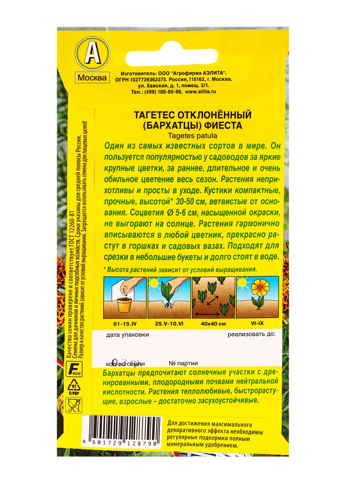 Семена цветов Бархатцы Фиеста отклоненные , Ц/П,0,3 г — Характеристики