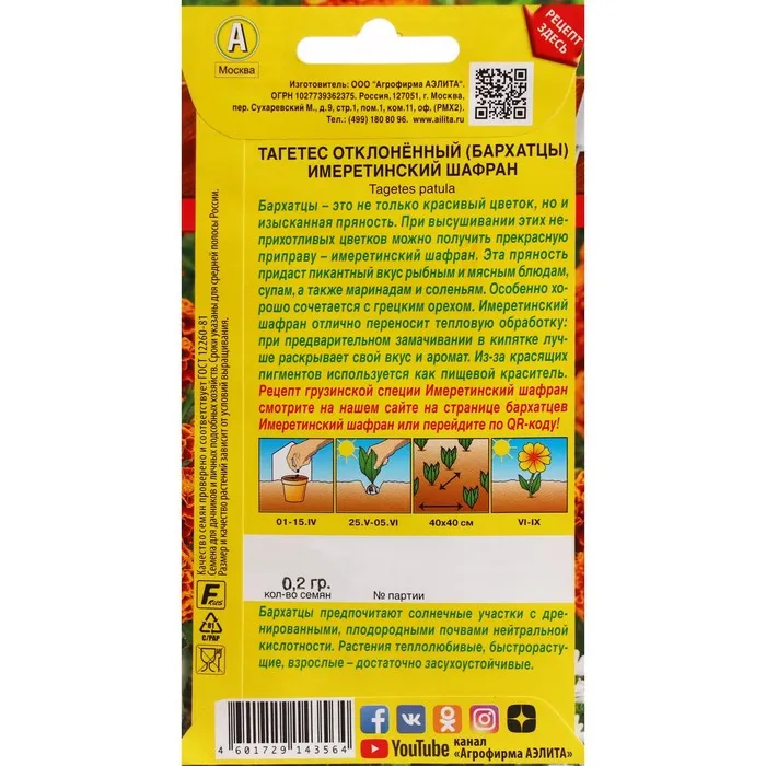Семена Цветов Бархатцы "Имеретинский шафран", отклоненные, ц/п, 0,2 г — Характеристики