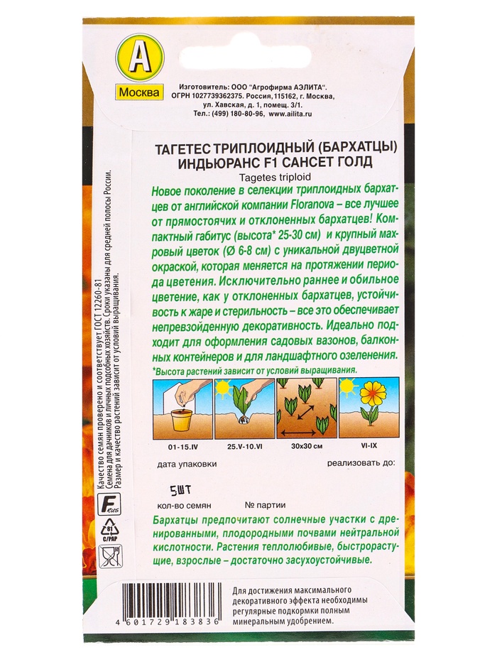 Семена цветов Бархатцы Индьюранс F1 сансет голд С. Floranova Золотая серия, Ц/П,5 шт. — Характеристики
