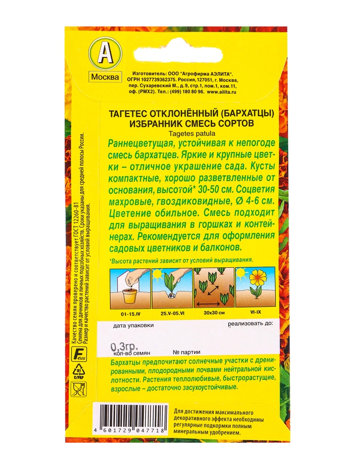 Семена цветов Бархатцы Избранник отклоненные, смесь сортов , Ц/П,0,3 г — Характеристики