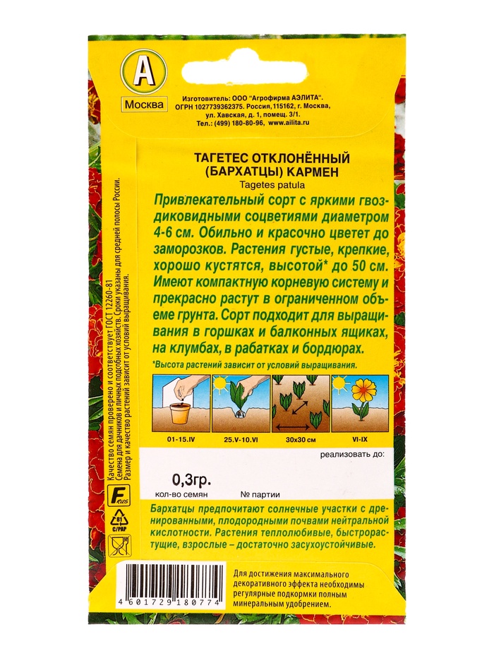 Семена цветов Бархатцы Кармен отклоненные , Ц/П,0,3 г — Характеристики