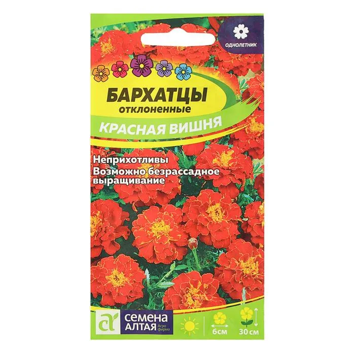 Яркие бутоны этого низкорослого сорта бархатцев будут украшать Ваш сад с июня до самых заморозков. Куст высотой 20-30 см в период цветения покрывается яркими коричнево-красными с золотистыми краями цветками, собранными в гвоздиковидные соцветия до 4-6 см в диаметре. Цветение с июня до заморозков. Отлично смотрится в оформлении балконных ящиков, вазонов. Прекрасно подойдёт для заполнения промежутков между более высокорослыми растениями, для оформления клумб, бордюров. Растение устойчиво к непогоде, светолюбиво, засухоустойчиво. Для хорошего роста и цветения растение нужно поливать и подкармливать в начале роста. Нетребовательно к почве, но при избытке влаги крупные соцветия начинают загнивать.