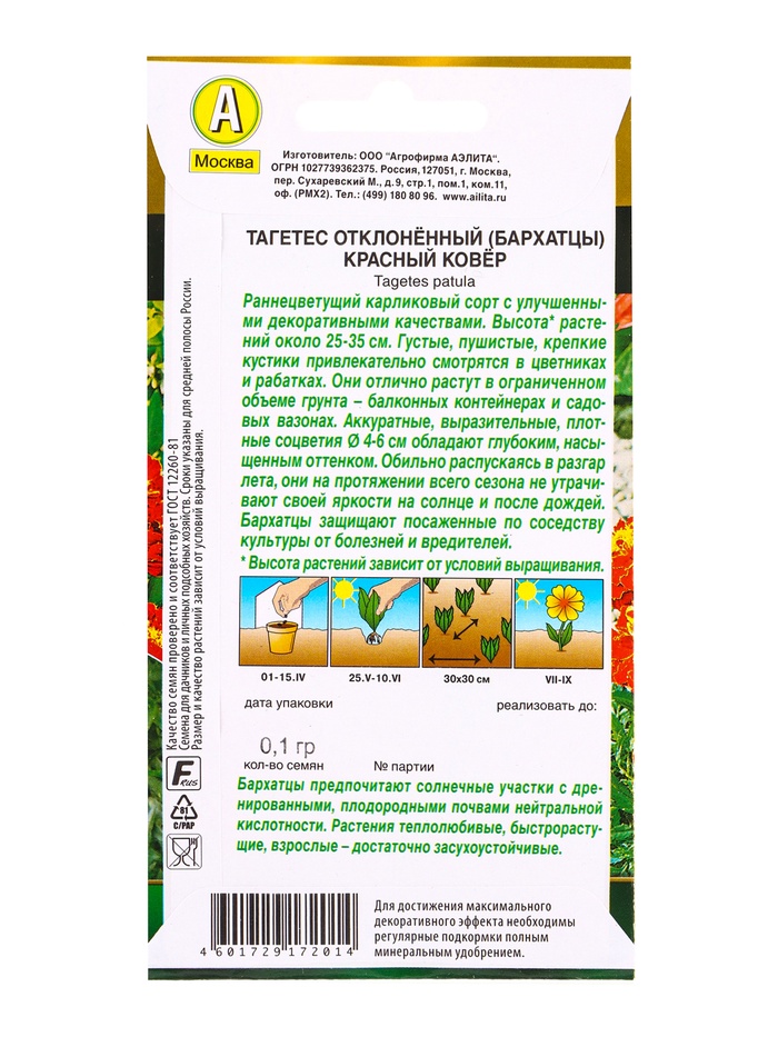 Семена цветов Бархатцы Красный ковер отклоненные Золотая серия, Ц/П,0,1 г — Характеристики