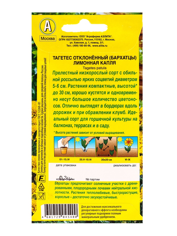 Семена цветов Бархатцы Лимонная капля отклоненные , Ц/П,0,3 г — Характеристики