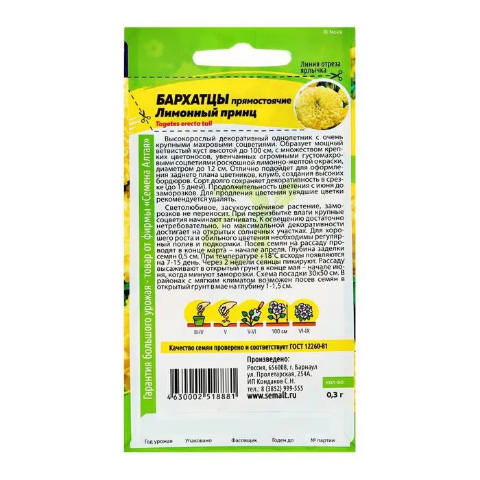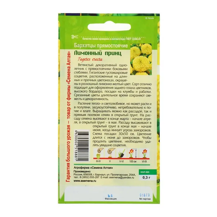 Высокорослый декоративный однолетник с очень крупными махровыми соцветиями. Образует мощный ветвистый куст высотой до 100 см, с множеством крепких цветоносов, увенчанных огромными густомахровыми соцветиями роскошной лимонно-желтой окраски, диаметром до 12 см. Отлично подойдет для оформления заднего плана цветников, клумб, создания высоких бордюров. Сорт долго сохраняет декоративность в срезке (до 15 дней). Продолжительность цветения с июня до заморозков. Для продления цветения увядшие цветки рекомендуется удалять. Светолюбивое, засухоустойчивое растение, заморозков не переносит. К освещению достаточно нетребовательно, но максимальной декоративности достигает на открытых солнечных участках. Для хорошего роста и обильного цветения необходимы регулярный полив и подкормки. Посев семян на рассаду проводят в конце марта - начале апреля. Глубина заделки семян 0,5-1 см. При температуре +18°С всходы появляются на 7-15 день. Через 2 недели сеянцы пикируют. Рассаду высаживают в открытый грунт в конце мая – начале июня, когда минуют заморозки. Схема посадки 30х50 см. В районах с мягким климатом возможен посев семян в открытый грунт в мае на глубину 1-1,5 см.