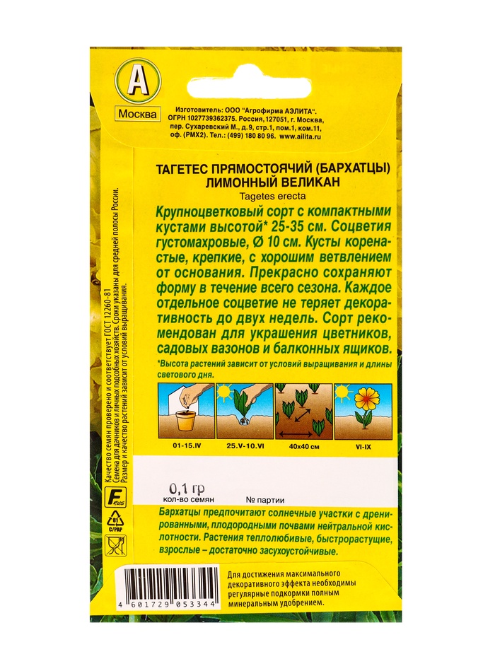 Семена цветов Бархатцы Лимонный великан прямостоячие , Ц/П,0,1 г — Характеристики