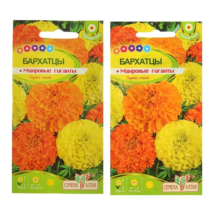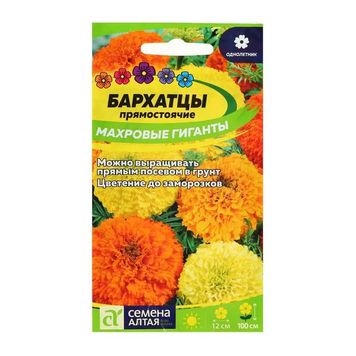 Высокорослые бархатцы с крупными махровыми соцветиями будут украшать Ваш сад с июня до самых заморозков. Растение неприхотливо и отличается длительным цветением. Куст высотой до 100 см с явно выраженным главным побегом. Соцветия крупные (8-10 см в диаметре) густомахровые различной окраски: оранжевой, золотисто-желтой и лимонно-желтой. Листья перисто-рассеченные от светло- до тёмно-зелёных. Применяются для посадки в цветники, на клумбы, бордюры и на срезку. Растение светолюбиво, засухоустойчиво, нетребовательно к почве и влаге, но при избытке влаги крупные соцветия начинают загнивать.