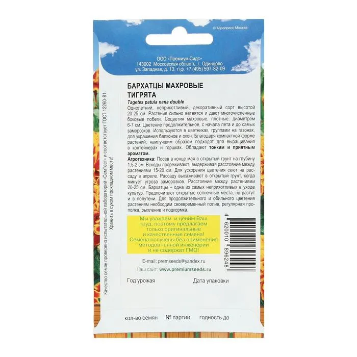 Посев в конце мая в открытый грунт на глубину 1,5-2 см. Всходы прореживают, выдерживая расстояние между растениями 15-20 см. Для ускорения цветения сеют на рассаду в апреле. Рассаду высаживают в открытый грунт, когда минует угроза заморозков. Расстояние между растениями 20-25 см. Бархатцы одна из самых неприхотливых в уходе культур. Предпочитают открытые солнечные места, но растут и в полутени. Для продолжительного и обильного цветения растениям необходим своевременный полив, регулярная прополка, рыхление и подкормка.