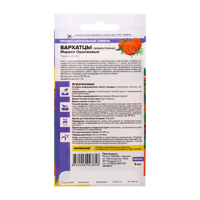 Новая серия быстрорастущих бархатцев поражает своей красотой и изумительными расцветками. Растение образует компактные кустики высотой до 25 см с крупными, до 7 см в диаметре, махровыми цветками насыщенного оранжевого цвета. Отличается ранним и продолжительным периодом цветения и устойчивостью к неблагоприятным погодным условиям. Идеально подходит для ландшафтного озеленения и посадки в вазоны и клумбы, будет эффектно смотреться как в балконных ящиках, так и в качестве горшечной культуры. Долго сохраняет декоративность в срезке, оказывает санитарное воздействие на почву. Неприхотливое, засухоустойчивое и светолюбивое растение, выносит небольшое затенение. Заморозков не переносит. Наибольшей декоративности достигает на открытых солнечных участках с питательными нейтральными суглинистыми почвами. Посев семян на рассаду проводят в марте. Глубина заделки семян 0,5 см. Посевы накрывают черной плёнкой для поддержания необходимого уровня влажности. При температуре +20-22°С всходы появляются через 7-10 дней, пленку убирают, температуру понижают до +16-18°С, во избежание вытягивания рассады. В грунт высаживают, когда минует угроза заморозков. Схема посадки 20х30 см. Цветение – через 2-2,5 месяца от посева. В районах с мягким климатом возможен посев семян в открытый грунт в мае на глубину 1,0-1,5 см.