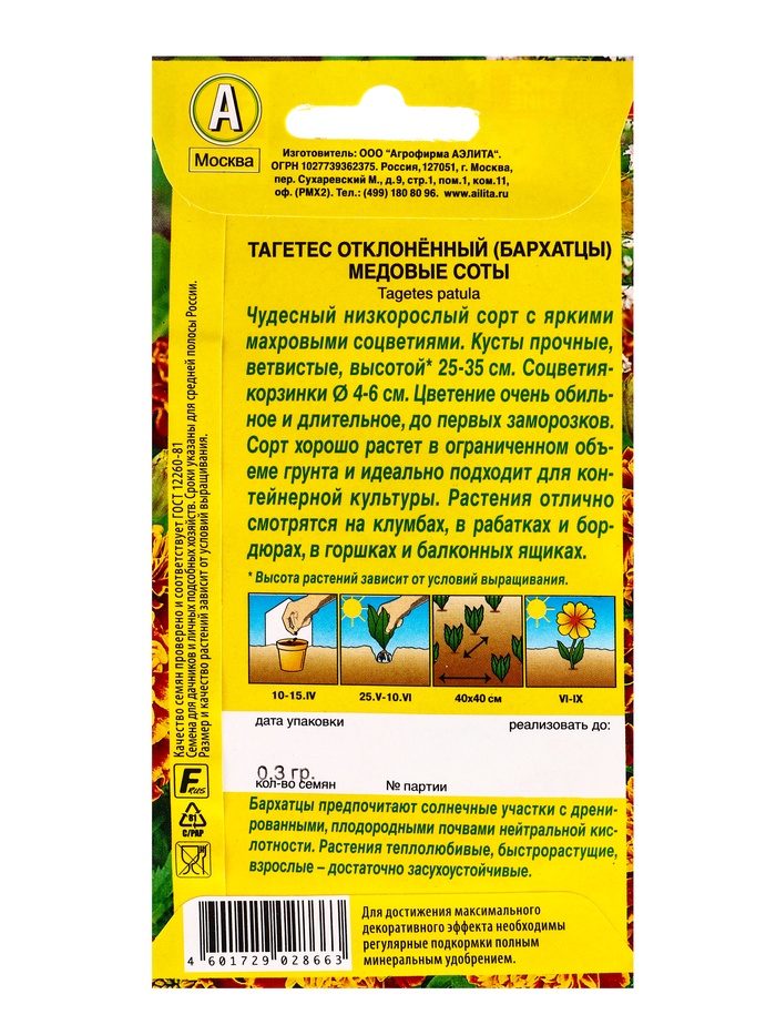 Семена цветов Бархатцы Медовые соты отклоненные , Ц/П,0,3 г — Характеристики