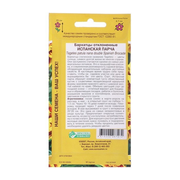 Семена цветов Бархатцы отклоненные "Испанская парча", 0,2 г — Характеристики