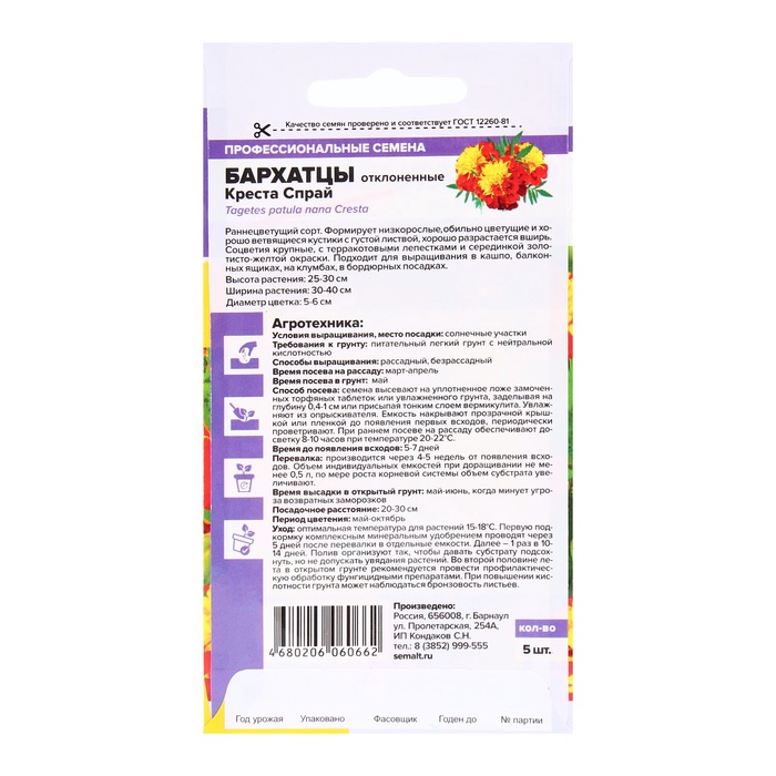 Бархатцы Креста Спрай махровые лучше всего растут на хорошо освещенных участках с легкой, питательной нейтральной почвой. Посев семян на рассаду проводят в конце марта или первой декаде апреля. Семена равномерно распределяют по увлажненному субстрату или торфяной таблетке, углубляя на 5-10 мм. Посевы присыпают тонким слоем вермикулита, опрыскивают с помощью пульверизатора и накрывают стеклом или полиэтиленом. Для посевов поддерживают температуру +20-23°С и досвечивание 9-10 часов. Первые всходы появляются на 6-8 день. Спустя 26-30 дней после прорастания ростков рассаду пикируют, в первой половине мая пересаживают на постоянное место. Через 5 дней после пикировки рассаду подкармливают комплексными минеральными удобрениями, в дальнейшем подкормки вносятся каждые 2 недели. В конце лета проводят профилактическое опрыскивание бархатцев фунгицидами.