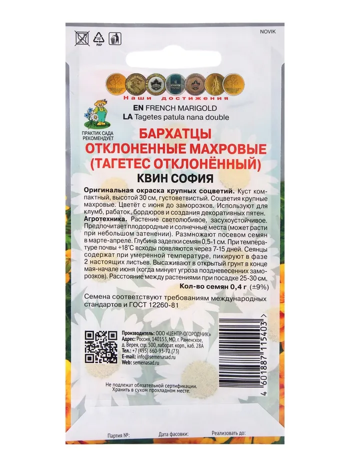 Семена цветов Бархатцы отклоненные махровые Квин София, 0.4 г — Характеристики