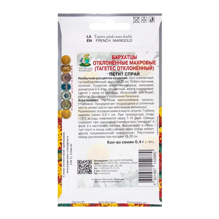 Семена цветов Бархатцы отклоненные махровые Петит Спрай, 0.4 г — Характеристики