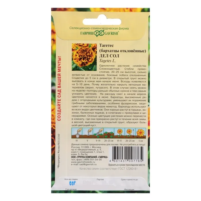 Однолетнее растение семейства Сложноцветные. Стебли прямостоячие, 20-25 см высотой, сильно ветвистые от основания, боковые побеги отклоненные. Соцветия до 5 см в диаметре. В открытый грунт можно высевать в конце мая-начале июня. Всходы появляются на 5-10 день. Почву желательно накрыть нетканым материалом (акрил, лутрасил). В этом случае сеять можно на неделю-полторы раньше обычных сроков и тем самым ускорить цветение. На рассаду сеют в начале апреля. Цветение начнется в июне. Бархатцы, высаженные рядом с огородными культурами, уменьшают их поражение грибными заболеваниями, особенно фузариозом, защищают от некоторых видов нематод.