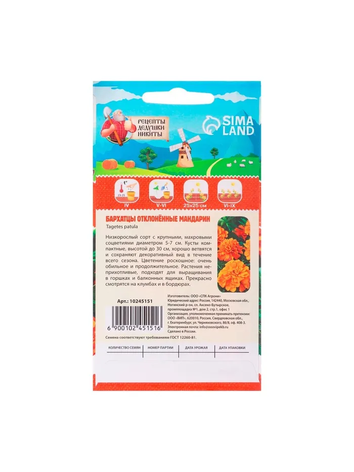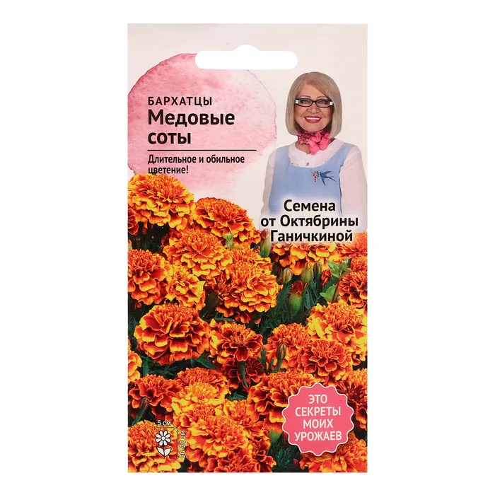 Бархатцы отклонённые "Мандарин"Семена цветов бархатцев отклонённых "Мандарин" представляют собой махровый сорт, который отличается яркими, оранжевыми цветами, напоминающими мандарины. Этот сорт часто используется в ландшафтном дизайне благодаря своей декоративности и яркому цвету.