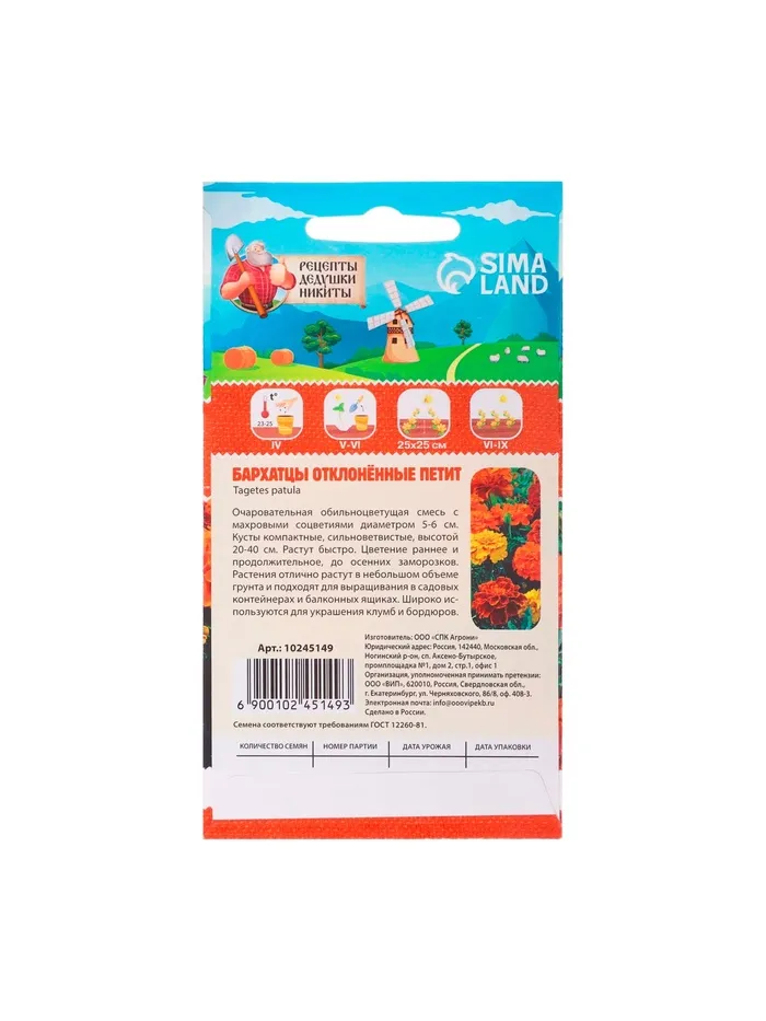 Семена цветов Бархатцы отклонённые «Петит», смесь, 0.3 г — Характеристики