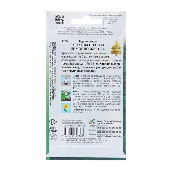 Семена цветов Бархатцы "Поллукс, лимонно-желтые", 10 шт — Характеристики