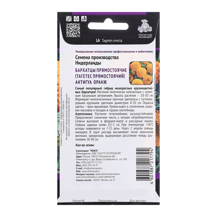 Семена цветов Бархатцы прямостоячие "Антигуа Оранж", 15шт — Характеристики