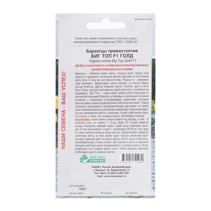 Семена упакованы в плотные, абсолютно непрозрачные металлизированные пакетики, защищающие на 100% содержимое от влаги. Особый металлизированный слой препятствует проникновению ультрафиолета и минимизирует воздействие окружающей среды, предотвращая перегрев или переохлаждение. Это позволяет получить посадочный материал высочайшего качества.